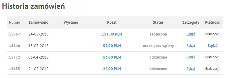 W tej zakładce macie Państwo dostęp do historii swoich zamówień np: